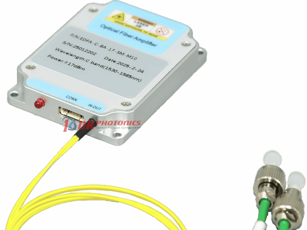 DK Photonics Erbium-doped Fiber Booster Amplifier in Micro-size for C-band can be used for power amplification of laser signals in the wavelength range of 1530~1565nm. It also adopts a unique miniaturized packaging design, which has the advantages of high gain, low noise, and small size, making it very suitable for use in narrow space conditions.