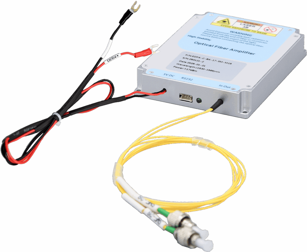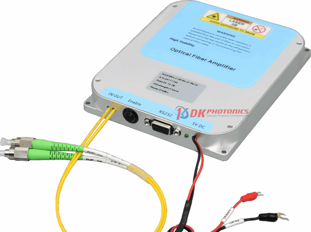 DK Photonics Erbium-doped Fiber In-Line Amplifier for C-band (LA, In-Line Amplifier) is an optical power amplifier product dedicated to line relay in fiber laser or fiber communication systems. It combines the advantages of PA amplifier and BA amplifier, with high gain, high transmit power, the advantage of relatively low noise is used between fiber sections to increase the length of the relay or in the corresponding single-to-multipoint part of the optical access network to compensate for branch loss.