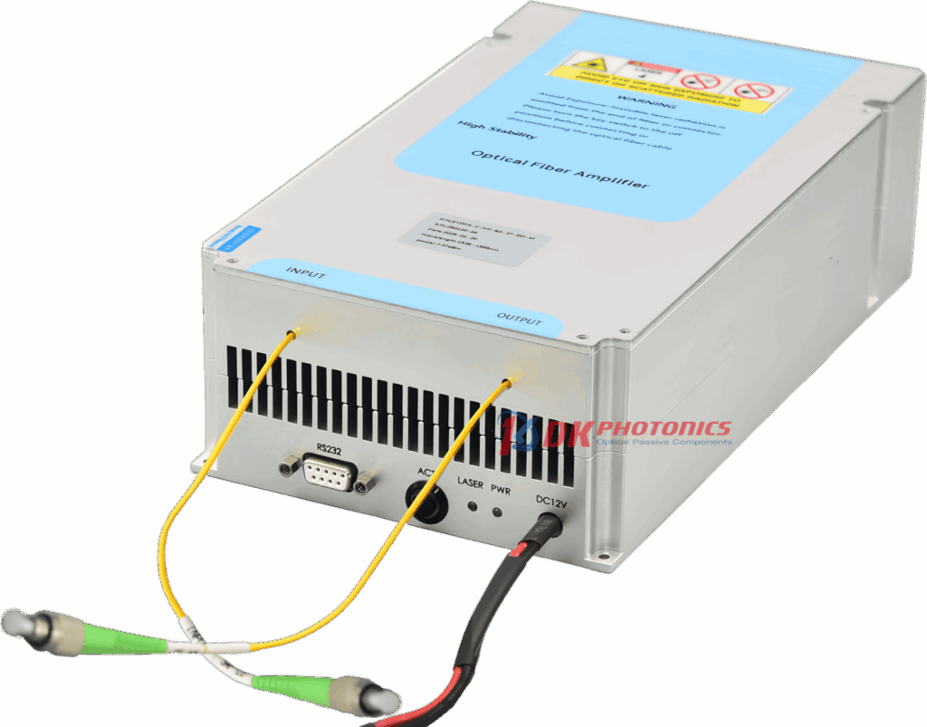 DK Photonics Thulium-doped Fiber Amplifier (TDFA) can be used to amplify 2um laser signals in the power range of -10dBm~+10dBm, with a maximum saturated output power of 40dBm. It is commonly used to increase the emission power of laser sources.